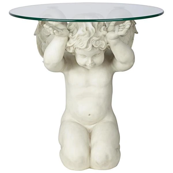 Elevate both your favorite beverage and your mood as they are held aloft by this heavenly table! With the finesse of heaven, an angel serves as the perfect fulcrum for this functional work of furniture art. Our exclusive is sculpted 360-degrees to be admired from all sides before being topped with a 3⁄8 -thick, 21-inch, pencil-edged glass top. Each curly lock, feathered wing and dimpled knee of this mythical cherub is cast in quality designer resin with a faux stone finish that turns furniture art into a showpiece that can stand up to modern usage. This is a celestial statement piece for home or garden! 21 dia.x20 H. 19 lbs.