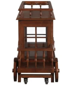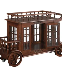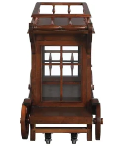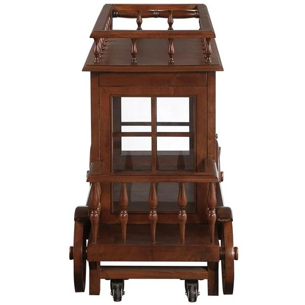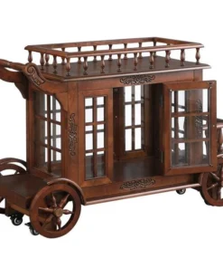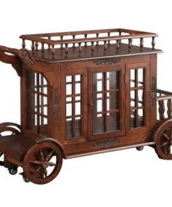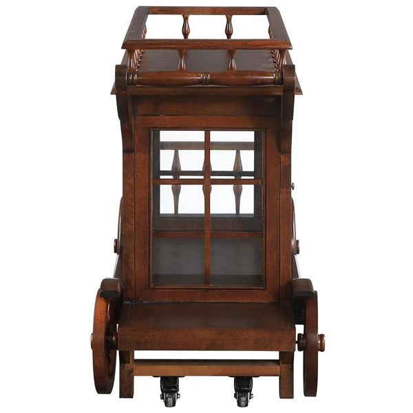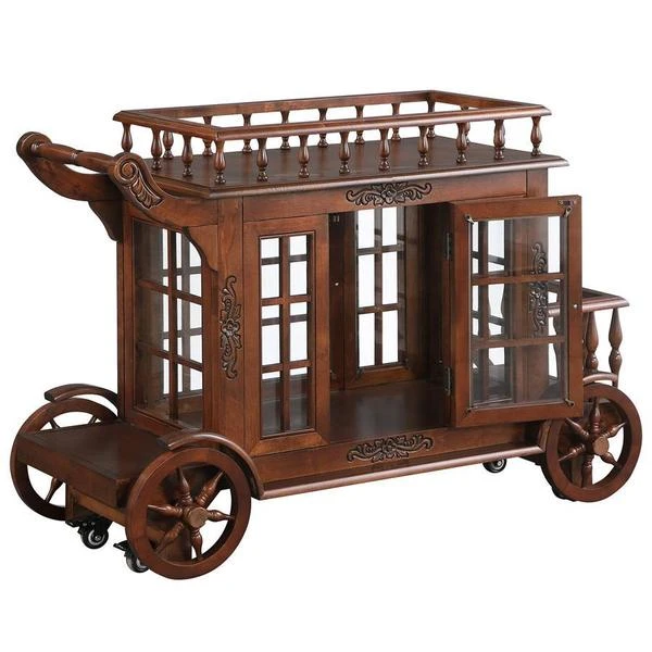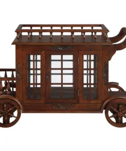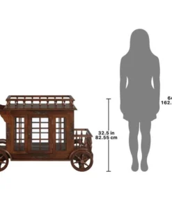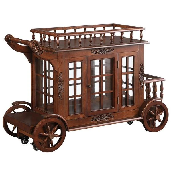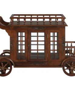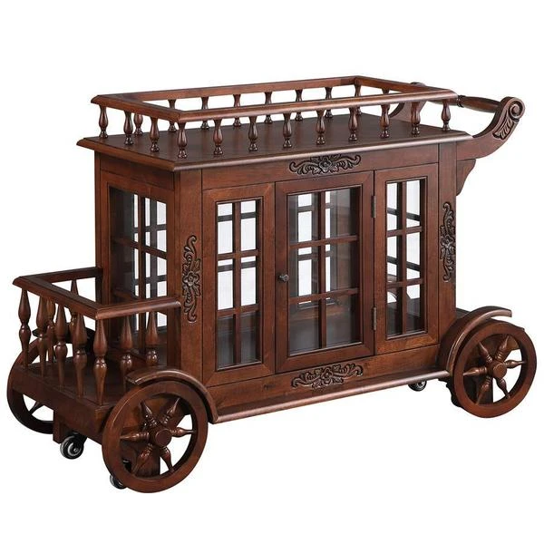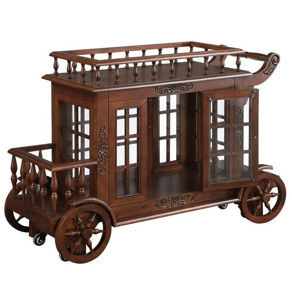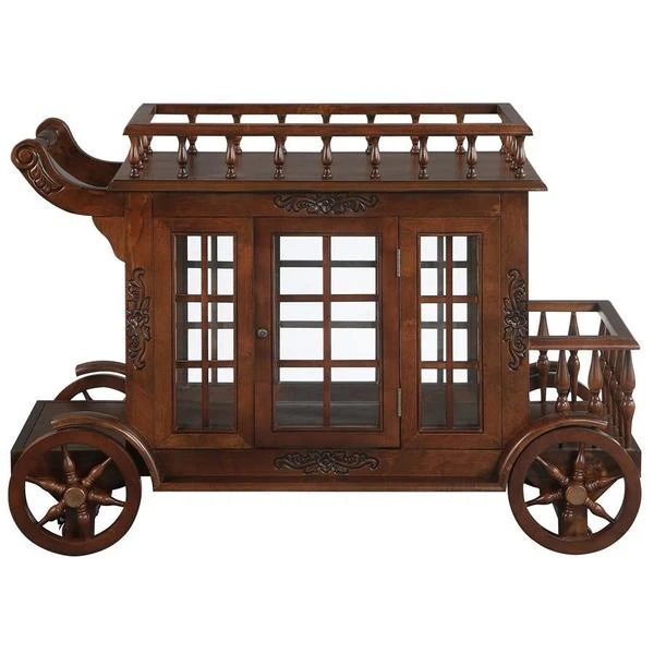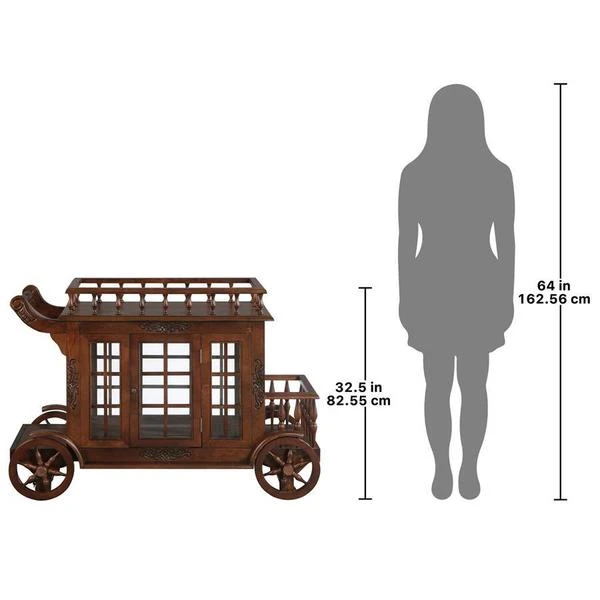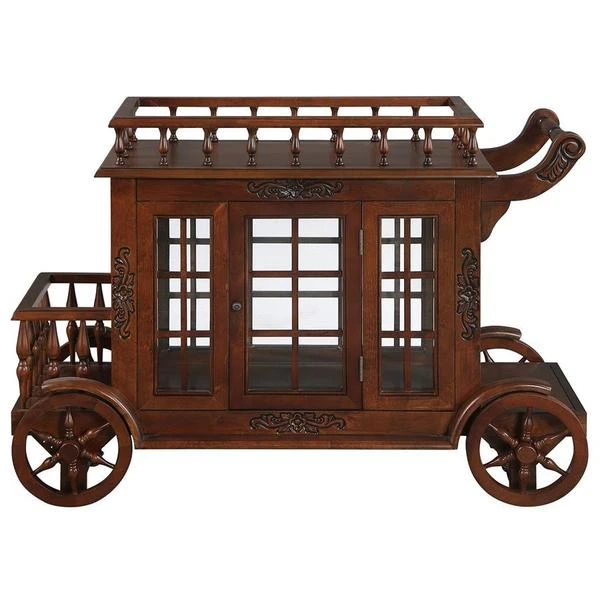 Recalling the rich romance of the stately horse-and-carriage age, this distinctive serving cart and liquor cabinet stands alone as sophisticated European furniture art, yet is at your beck and call regardless of the occasion! Hand-carved of solid hardwood, it offers two glass-paned doors that open for easy access to your bottles and stemware. A top handle and four wooden wheels (with hidden caster wheels) allow easy movement from room to room. This Design Toscano-exclusive, bar cart is authentic, rich period furniture art that is nothing short of amazing! Simple assembly required. 46"Wx18"Dx321⁄2"H. 69 lbs.