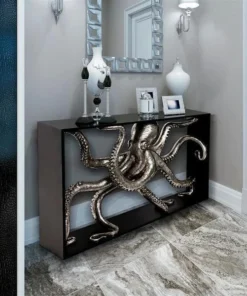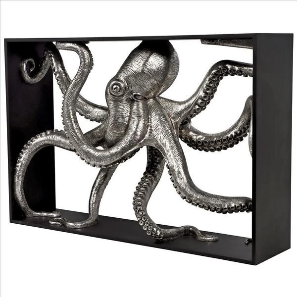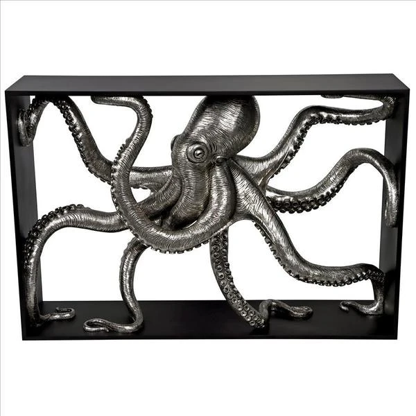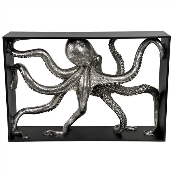This may be the most exciting ocean octopus since Jules Verne wrote the battle of Captain Nemo and the submarine Nautilus! Our 20,000 Leagues Under the Sea, Steampunk-inspired work of decorative furniture art shapeshifts the sea's most mysterious invertebrate into a massive mollusk console table, perfect as oceanside nautical decor or in a spirited tiki bar. Our Design Toscano exclusive is sculpted with marine details, it is cast in quality designer resin with a silver leaf and framed in wood with a faux ebony finish. An instant seaside, nautical decor standout!
