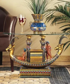 Drawing upon the original found in the 3,500-year-old annex to the tomb of Tutankhamen, this artistically sculpted artifact is fashioned into a distinctive work of functional art that combines Egyptian design with contemporary needs. This 18 lb. quality designer resin barge boasts exquisite hand-painting in the royal Egyptian palette and is displayed beneath a 1⁄4" thick, pencil-edged, oval glass top measuring almost a yard wide. 31"Wx15"Dx191⁄2"H. 18 lbs.