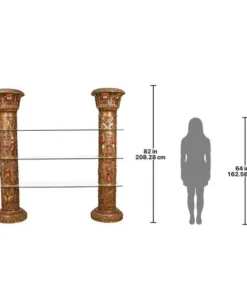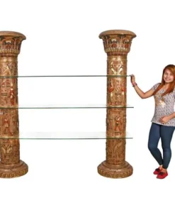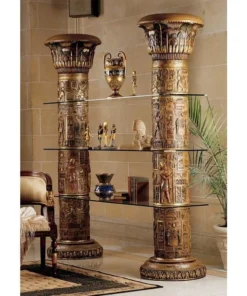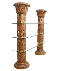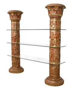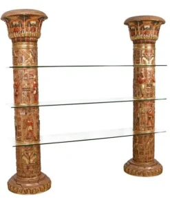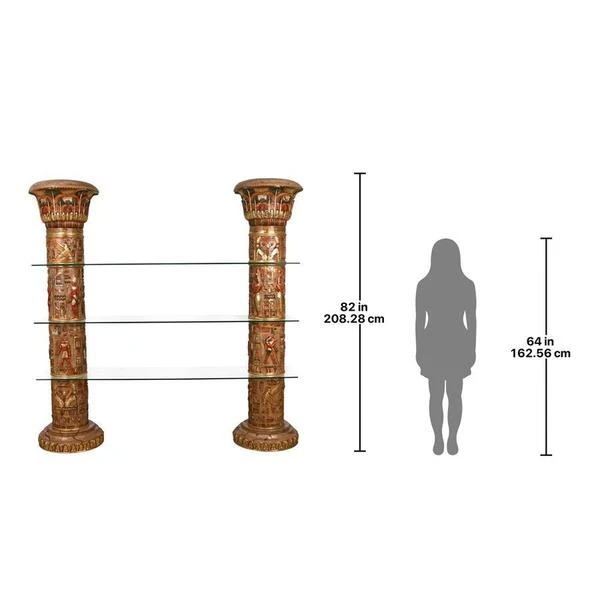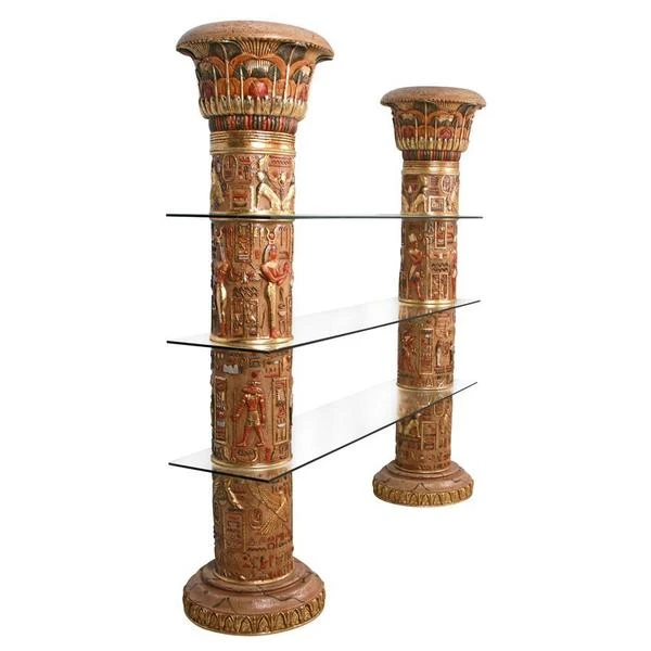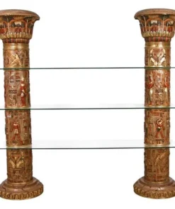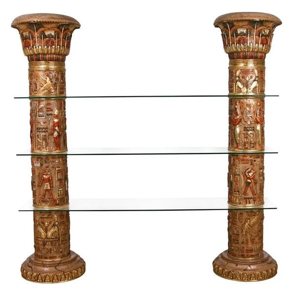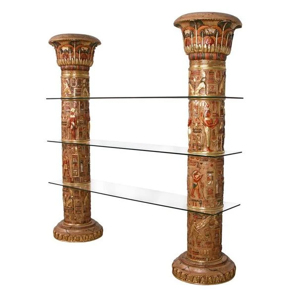 Rising like the famed Egyptian columns for which it is named, our seven-foot-tall work of furniture art is intricately carved and crowned with lotus leaf capitols. Cast in quality designer resin and dramatically hand-painted with rich hieroglyphics and the figures of antiquity, our replica is highlighted by a weathered, faux stone finish with real gold leaf accents. Set with three over six-foot wide expanses of tempered glass to showcase your collectibles and artifacts. Columns arrive in 6 boxes for safety in shipping. 76"Wx21"Dx82"H. 144 lbs.