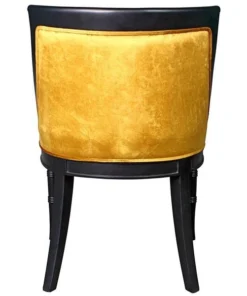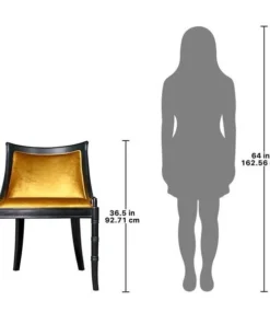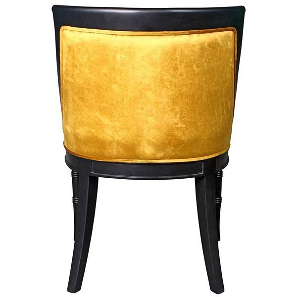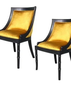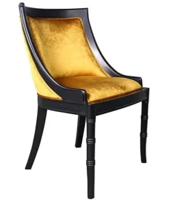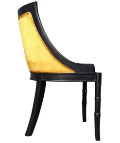Fit for a ruler, these timelessly stylish, solid mahogany side chairs boast quietly elegant lines from their faux bamboo turned legs to the gentle curve of their comfortable, swing back design. Ebony matte finishes hint at their Neoclassical Roman lineage, but the plush, double-welted gold upholstery front and back assures that they will find a comfortable home with any decor. A pair at each side of a fireplace, credenza, or boudoir welcomes guests to find peace and respite at any time of day. Each: 231⁄2"Wx231⁄2"Dx361⁄2"H. 20 lbs.