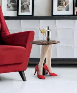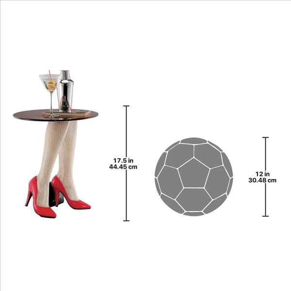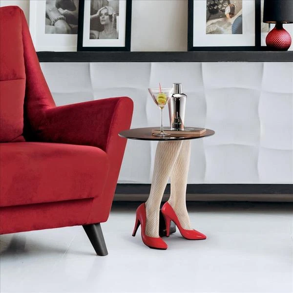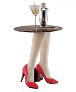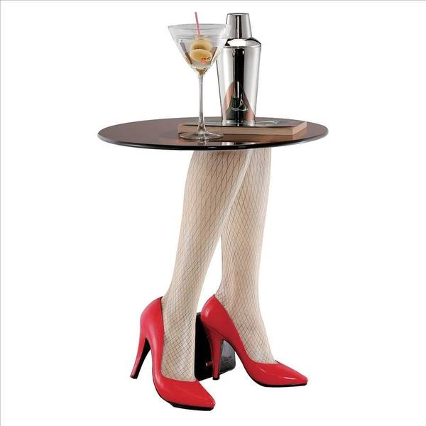Playful and oh-so-much-fun, this work of retro 1950's Pop Art grabs the legendary bright red pumps, black handbag and fishnet stockings to attract it's own brand of attention in your home or gallery! The smoked, 3/8" thick, pencil edged, tempered glass 16" table top sits atop a pair of shapely designer resin legs as hand painted functional art that can't escape its role as a centerpiece wherever you put it! 16"dia.x171⁄2"H. 23 lbs.