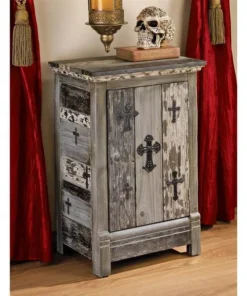 Our aged masterpiece Gothic Sanctuary table is seemingly straight from a passionately dark Vampire novel. This Toscano-exclusive work of Gothic furniture art, crafted of Paulownia wood, boast Victorian-style metal crosses on three sides. We individually hand distress these Gothic-style pieces with one of the most remarkably weathered, Goth faux finishes our craftsmen have ever created. 20"Wx141⁄2"Dx30"H. 21 lbs.