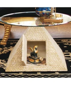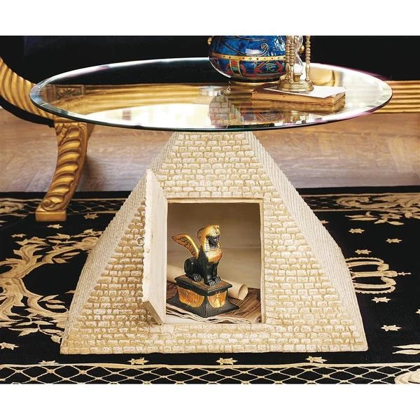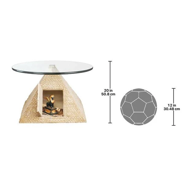 Though the pyramids of ages past held their secrets through the centuries, we'll give you the covert clue to ours right away – it has a hidden door! Our statement piece of decorative furniture art serves up a creative synergy of style and function when a perfect circle of over 2 feet of thick, beveled-edge glass is magically and almost invisibly secured to its fulcrum. Our quality designer resin table is finished to replicate the sandstone tones of the original. See Additional Views for details. 271⁄2"dia.x171⁄2"H. 47 lbs.