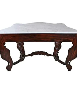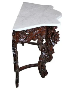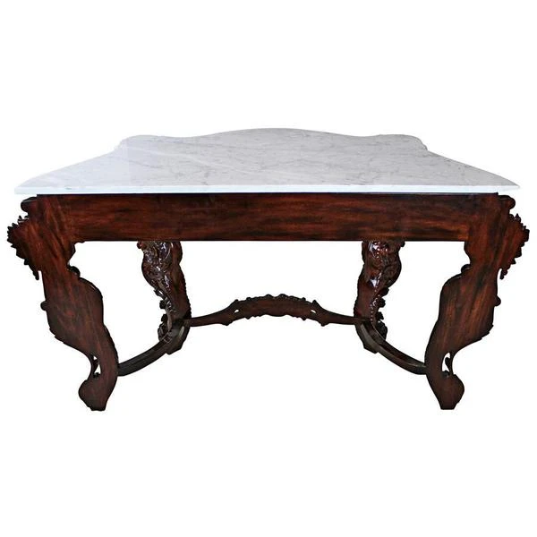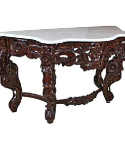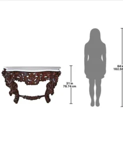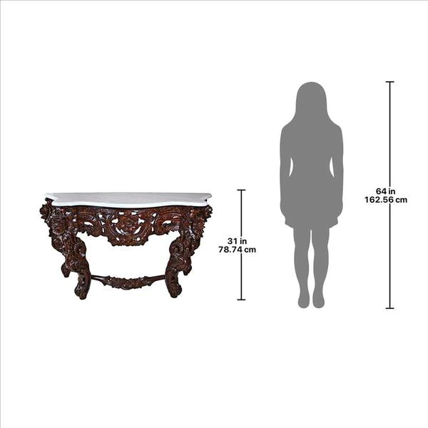 This elegant solid mahogany piece is so fraught with intricate floral scrollwork that it takes more than a week to hand-carve each one! Replicating those seen in grand Viennese salons, ours are hand-finished and slightly distressed to resemble true antiques. The console rises on four ornate legs to a solid white marble top with French-cut edges. Add a touch of history with this statement piece, perfect for your foyer, library, or formal living room. Console Table: 54"Wx22"Dx31"H. 85 lbs.