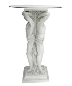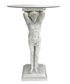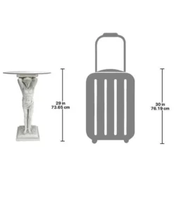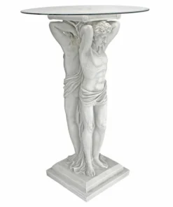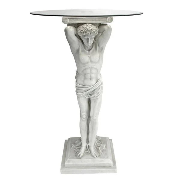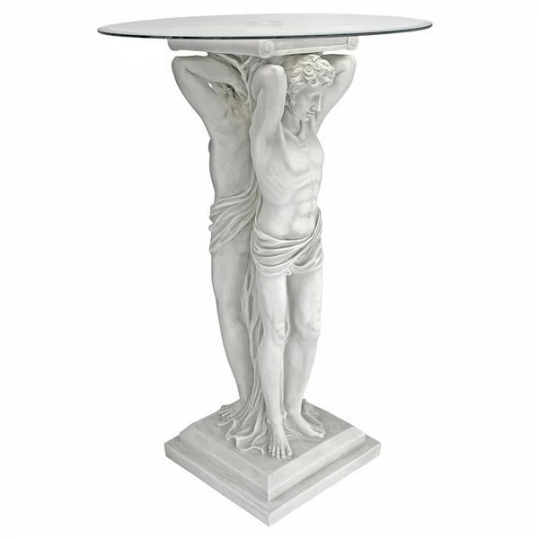 With a nod to the internationally-admired Neoclassical portico that anchors Russia's Hermitage Museum, the artist of this work of furniture art was inspired to adapt a pair of strong Atlas figures as pediments. Cast in quality designer resin with an antique stone finish, the Basil Street Gallery idealized male figures, aptly placed on a pedestal for full display, are exquisitely positioned beneath a 3⁄8" thick, glass top measuring a foot-and-a-half wide. 181⁄2"dia.x29"H. 13 lbs.