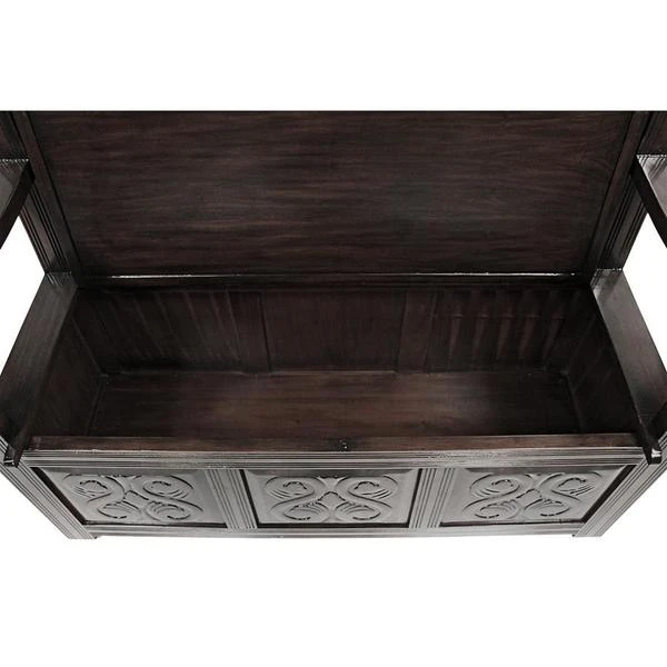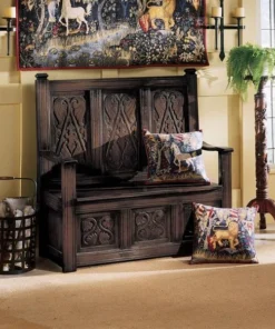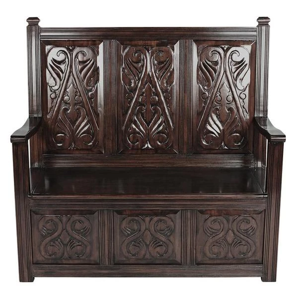 Our favorite English antique dealer agreed to have this stunning medieval Monk's Bench reproduced for us complete with all its rich, handcarved details. Clergy members used it to store vestments before the advent of closets. Both stylish and functional, this heavyweight, high-back bench with carved panels, provides seating for two, and deep storage for items such as fine linens, books or treasures from a bygone era. For authentic character, it takes over two weeks to hand carve and hand-finish the solid mahogany to replicate the original antique. A Toscano exclusive. Simple assembly required. 48"Wx21"Dx48"H. 90 lbs.
