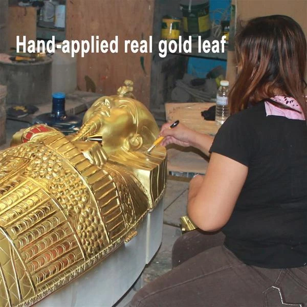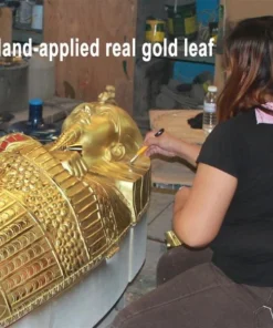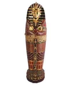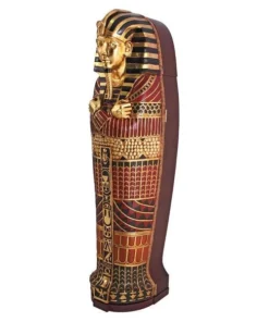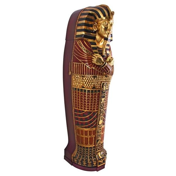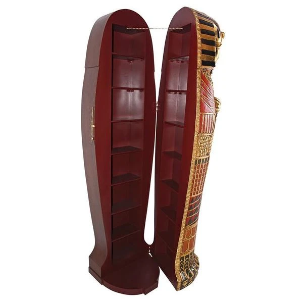 The exotic mystery of ancient Egypt realizes its most famous artifact in the sarcophagus. These artistic rarities have been long coveted by museums and private collectors alike. Now our cabinetmakers have replicated the sarcophagus that held King Tutankhamen for more than 3,000 years. Measuring taller than most men (61⁄4 feet), our sarcophagus opens to reveal 14 storage shelves. Hand-crafted of solid wood with resin details and hand-painted in an Egyptian palette with real gold leaf accents, it can be wall-mounted for added stability. Curbside delivery. 21"Wx20"Dx75"H. 128 lbs. Door shelves: 10.9" Wx3.9" D Cabinet shelves: 10.9" Wx6" D Height between shelves: 8.6" vertical. Shelves are also removable.