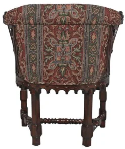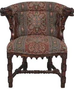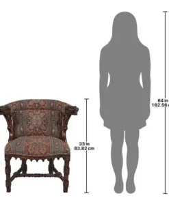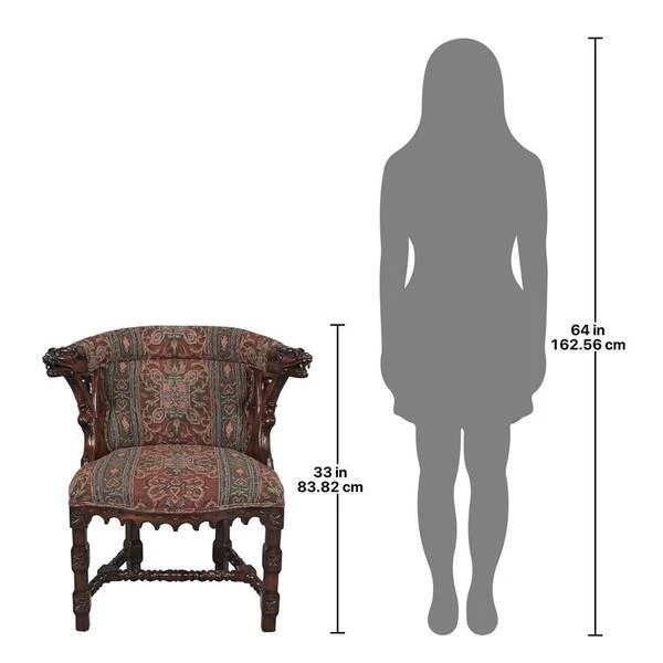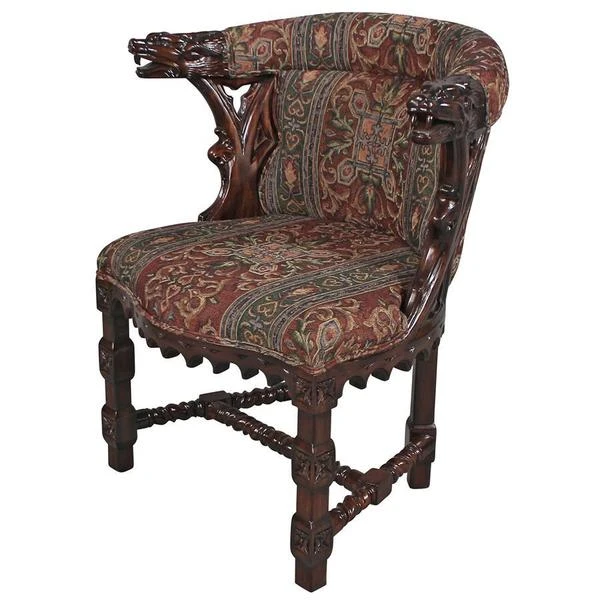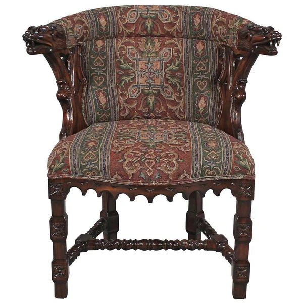 As impressive as any you'd find in an old English library, this replica, with deeply undercut dragon heads showcased by Gothic trefoil designs, requires a full week for our master carver to create! Hand upholstered front and back, in a quality custom designed heraldic griffin jacquard fabric, this comfortable chair glows in a rich, hand rubbed finish. This signature antique replica is a handsome Gothic-style work created exclusively for Toscano. Its style is a true investment in European beauty and stunning work of handcarved art. See additional views for upholstery color swatch. 251⁄2"Wx201⁄2"Dx33"H. 22 lbs.