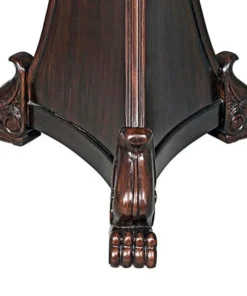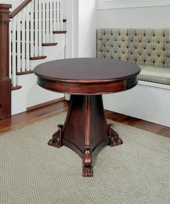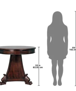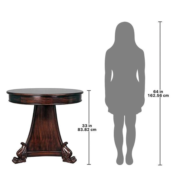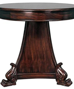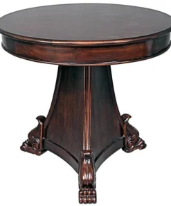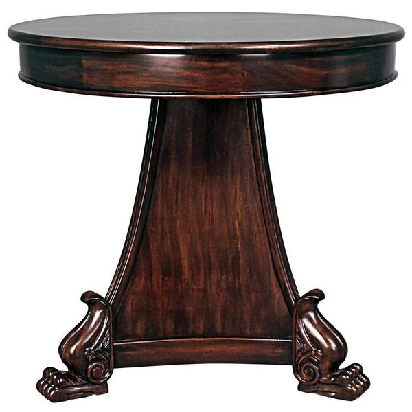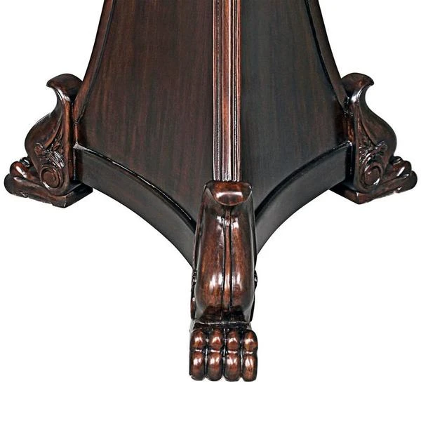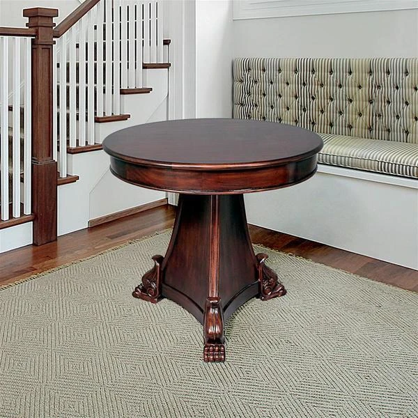 Choose a smart pedestal table with a distinctly European lineage to elevate your design to the next level! Rising from deeply hand-carved paw feet and a triangular central core toward a double bevel crowned top, this solid mahogany Basil Street masterpiece with dark, polished finish is a true standout. Popular since the court of Louis XIV, this gueridon style work of furniture art may be perfectly positioned beneath a painting, aside a chair or stationed in a front hall as a replica antique worth admiring. Simple assembly required. 32"dia.x33"H. 40 lbs.