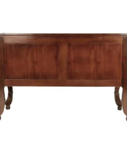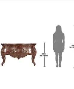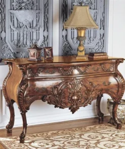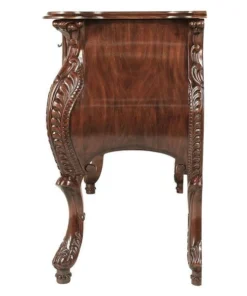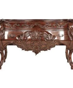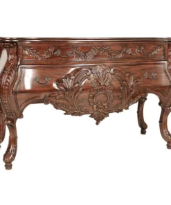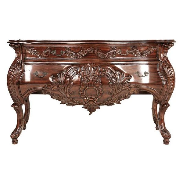 Sized to impress, almost five feet of handcarved, solid mahogany swells with 18th century French detail in this period antique replica like those found in palaces along the Loire. While a true antique of this caliber goes for tens of thousands at auction, our master carvers spend three full weeks to create this affordable quality masterwork. Our replica recreates the detailed flowers and curved bombe lines that make it virtually indistinguishable from the originals, then adds two large, deep drawers and vintage-style antique brass pulls for even more splendor. 58"Wx22"Dx36"H. 110 lbs.