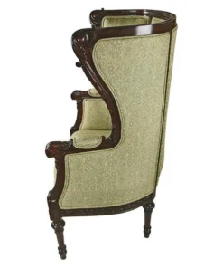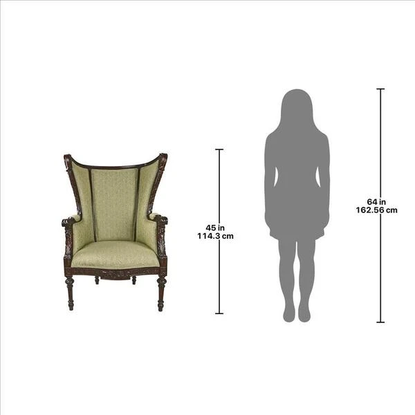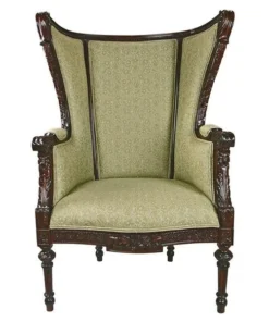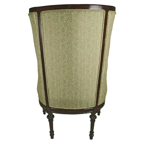 Once only a statue symbol of the elite, our exclusive, early 19th-century, English-inspired wing back chair is now a coveted piece for stunning homes. One of the most recognizable and timeless styles of classic furniture, our version boasts carved, fluted legs and upholstered arms. You'll sink into the plush upholstered front and back in a quality, muted celadon jacquard with double welting. The glowing, solid mahogany wood of this syylish, period work of furniture art enhances the beauty of this exclusive created by our Design Toscano master carvers. 30"W x 23"D x 45"H. 33 lbs.