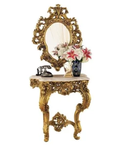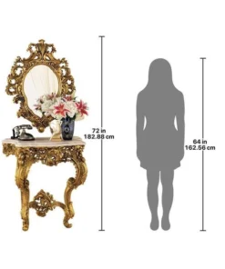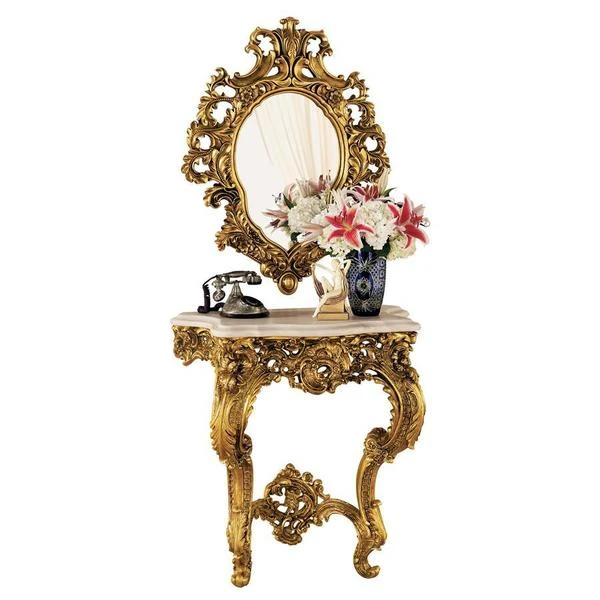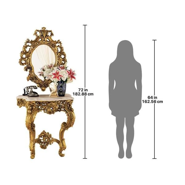 Sculpted roses spring forth from this replica 17th century antique destined to become a striking centerpiece of your home. Designed to anchor safely to a wall, the stately, almost yard-tall console is topped with a beautiful, quality faux marble top. The generously sized, companion salon mirror sparkles to reflect its own ornate, beribboned sculpt. Beautifully paired in a stylish entryway, both grand scale pieces are cast in quality designer resin and finished in faux antique gold as an investment in European style. Table: 32"Wx17"Dx35"H. 42 lbs. Mirror: 28"Wx37"H. 19 lbs.