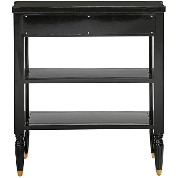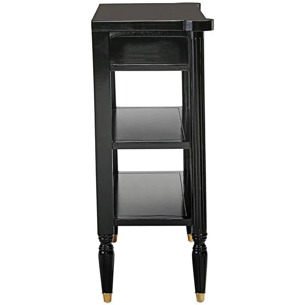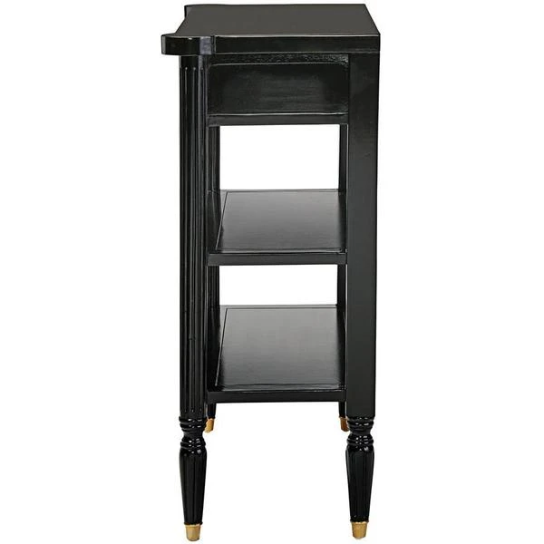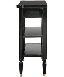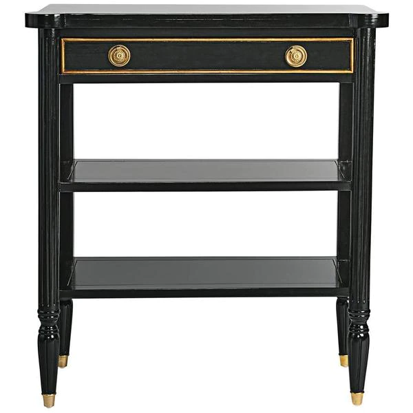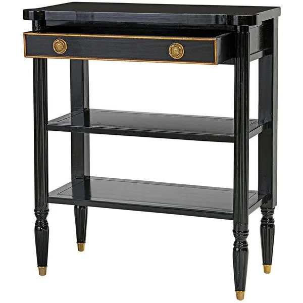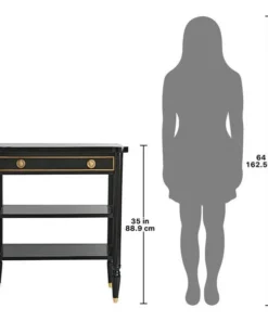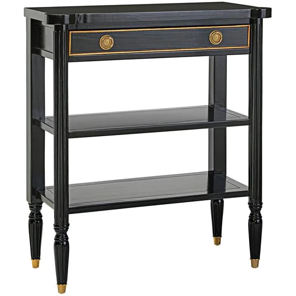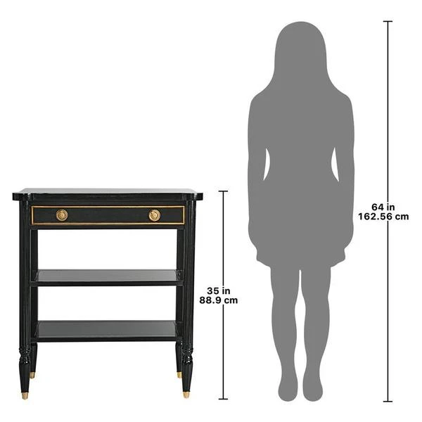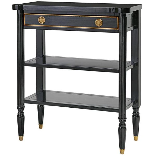 The smart, sleek design of this console still boasts some of the classicism of Paris's Ecole des Beaux Artes in its 1940s French Revival design. Crafted of solid mahogany, it rises on metal feet toward two generous shelves and a single drawer with gold accent detail and ornate brass, Empire style ring pull handles. With a richly ebonized finish that melds with most any decor, this Design Toscano exclusive is full of European refinement. Serve guests or display treasures with this work of functional furniture art that brings a beautiful vintage feel that's refined but not fussy. 311⁄2"Wx141⁄2"Dx35"H. 40 lbs.