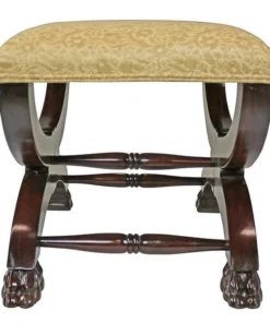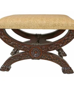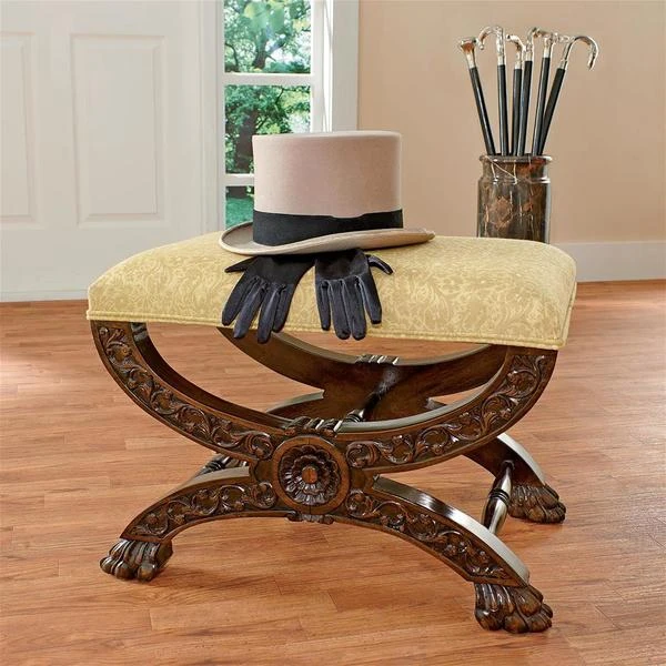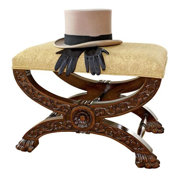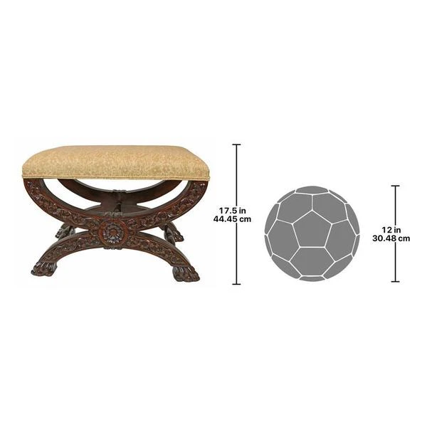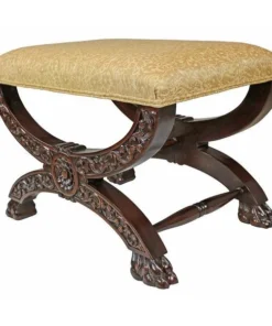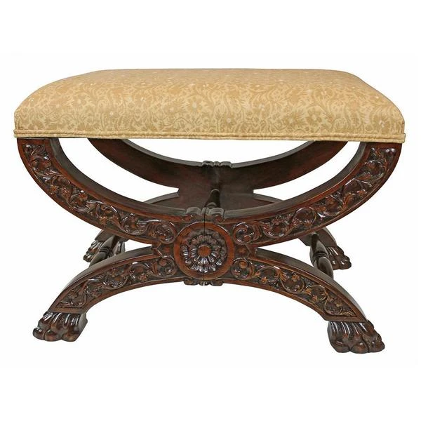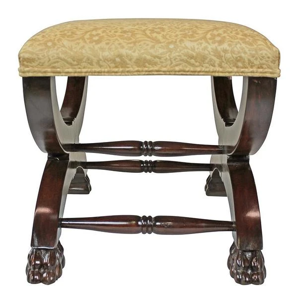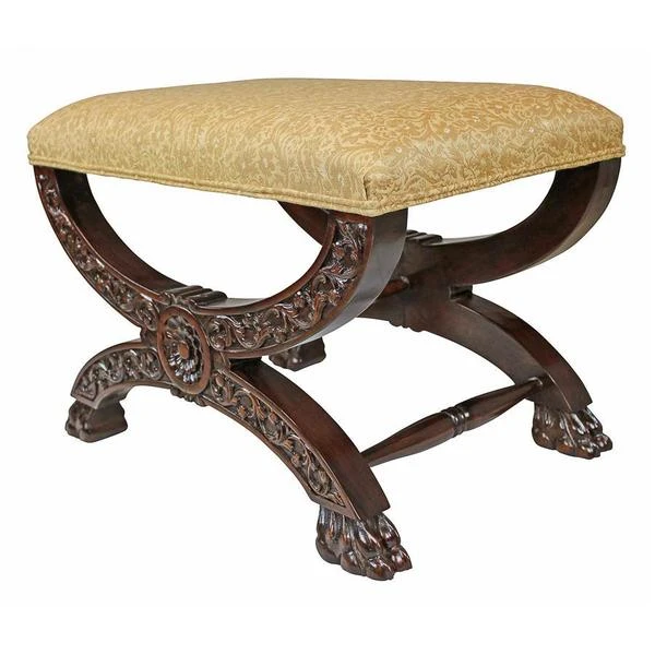 Welcome the rich pageantry of a classic 17th century, x-framed Roman sella curulis or magistrate's chair to your home. Heavily hand-carved solid mahogany, our stool features a leafy scroll of pierced acanthus and curved cross bars terminating in wide, paw feet. Luxuriously upholstered in a butter yellow and alabaster floral jacquard, this distinctive Medieval replica bench is sure to find the perfect spot in living room, boudoir or den. 231⁄2"Wx16"Dx171⁄2"H. 14 lbs.