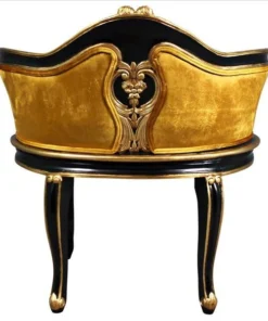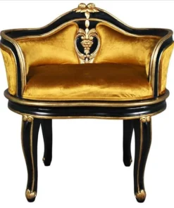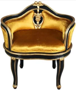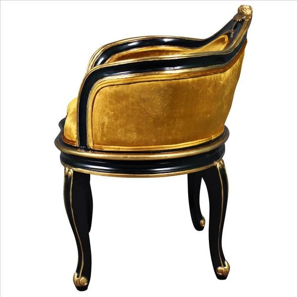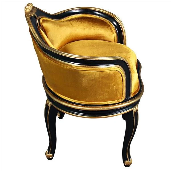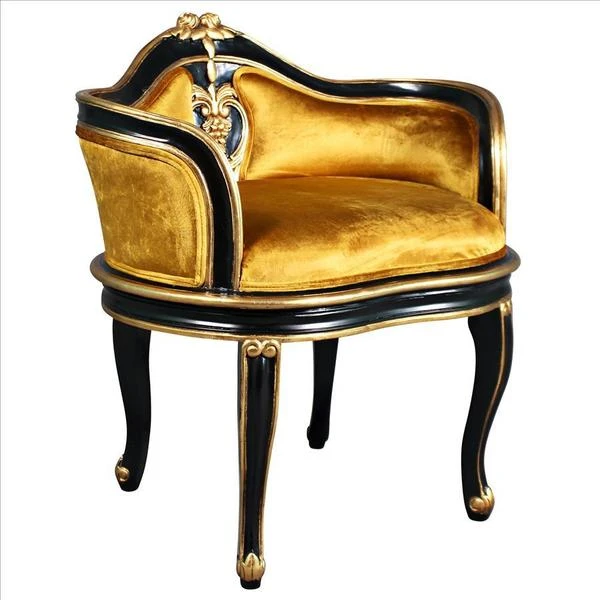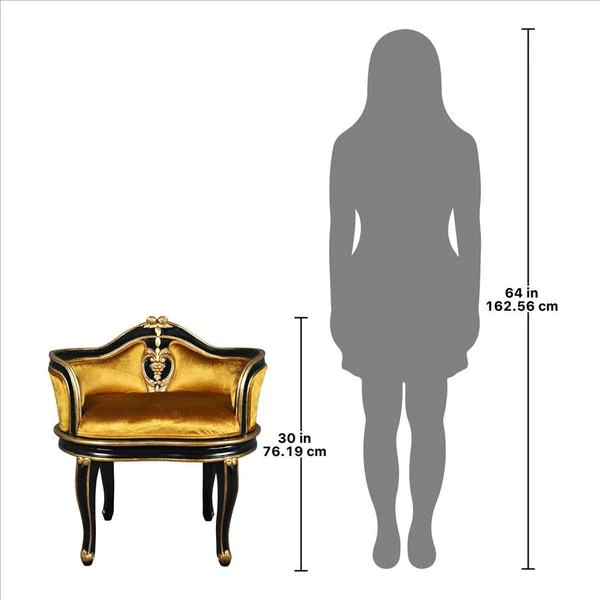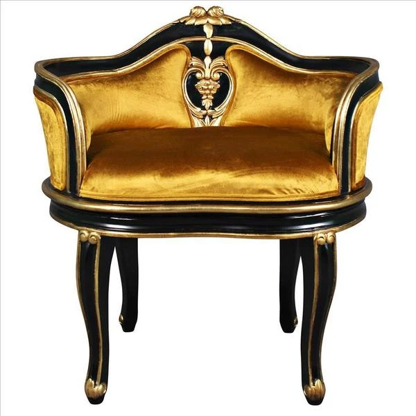 Have a spot in need of a little quiet attention? Named for the soubrettes, the coquettish ladies-in-waiting for the queen, this standout work of mahogany furniture art elevates the Rococo style of Louis XV to a luxuriously polished crescendo. The eye is drawn toward the incredibly beautiful, pierced, acanthus embellished center detail, then sent long the wide serpentine back and the curving acanthus-kissed legs. With a decidedly French accent, our replica work of furniture art features faux ebony and gold gilding punctuated by a lush, golden velvet upholstery on its plush, padded seat. Add Parisian style to any room with this Design Toscano exclusive.