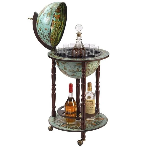 Raise a toast to honored guests from a 14"dia. Italian-style globe bar ensconced in authentic parchment-printed, 16th century replica nautical maps from the National Museum of Science in Florence. Bursting with Old World charm, our functional work of art opens from a hinged meridian to reveal artistic interior frescoes reminiscent of domed ceiling contraspecto ("view from the heavens"). Our Toscano exclusive boasts secure spots to show off your treasured decanter bottles and collectible liquor and barware. A trio of handsome, turned hardwood legs rises from rolling casters and a circular lower shelf, allowing additional storage and a moveable liquid feast! Simple assembly required. 181⁄2"dia.x36"H. 16 lbs.