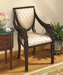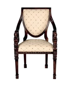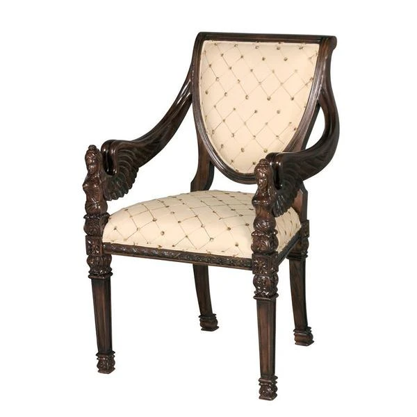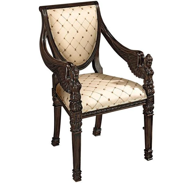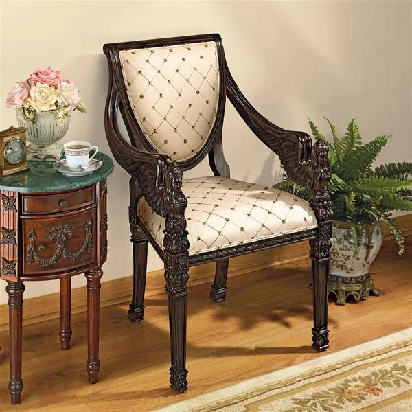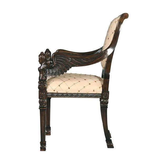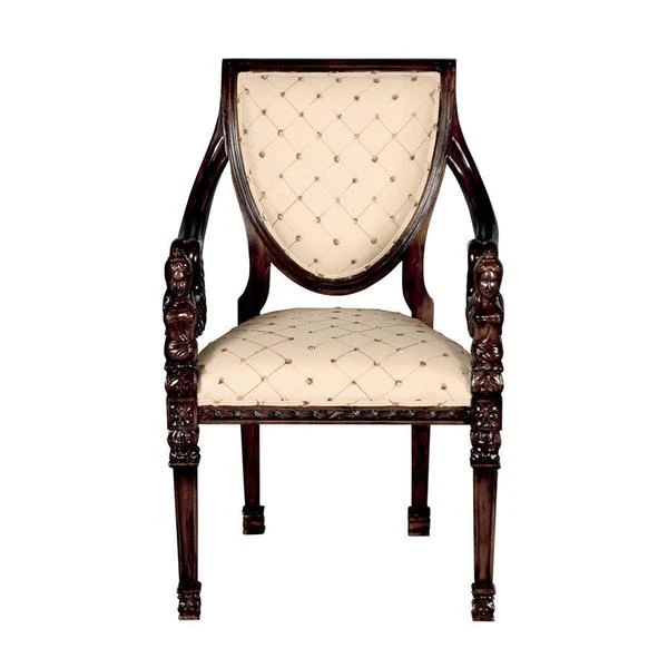 Two angels with feather wings flank the ornate carvings in the mahogany construction that rises to wrap the shield back design of this work of furniture art. Stately and comforting, its tapered square feet give way to a welted cream and gold lattice print upholstery sure to add grace to any decor. Whether you choose this Design Toscano exclusive chair for living room, bedroom, entry hall or even a fashionable office, you'll fall in love with its timeless style. 24"Wx19"Dx38"H. 24 lbs.