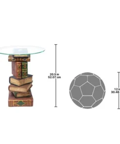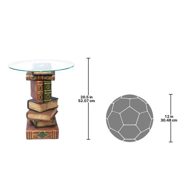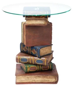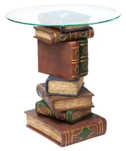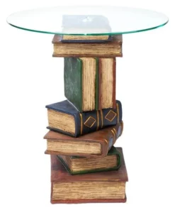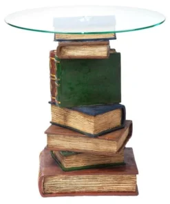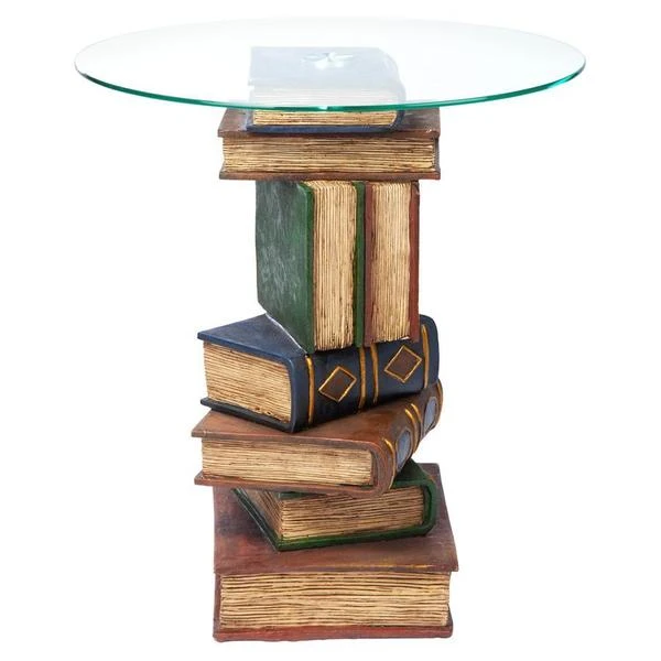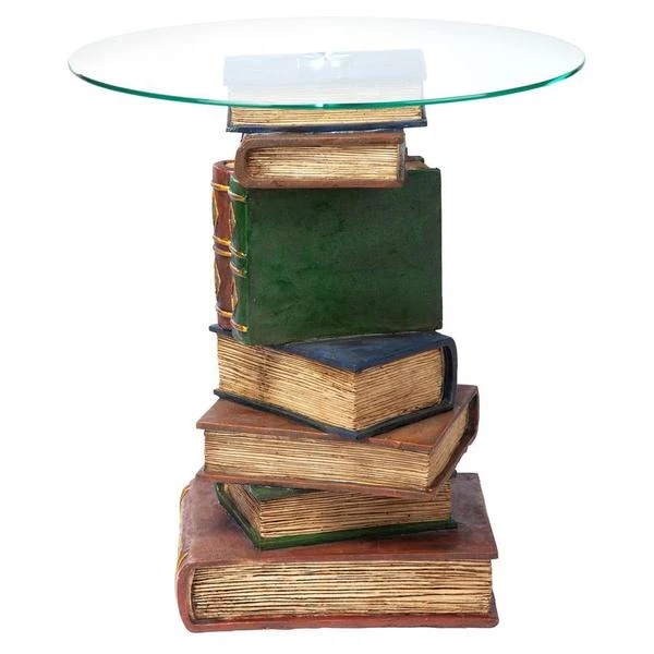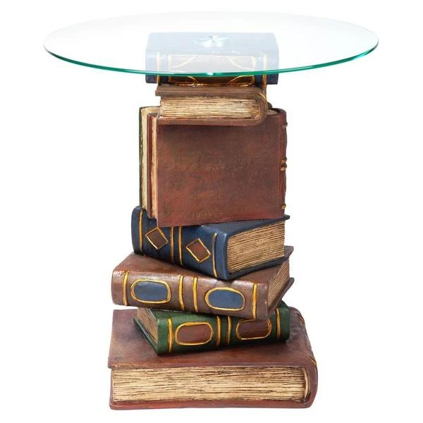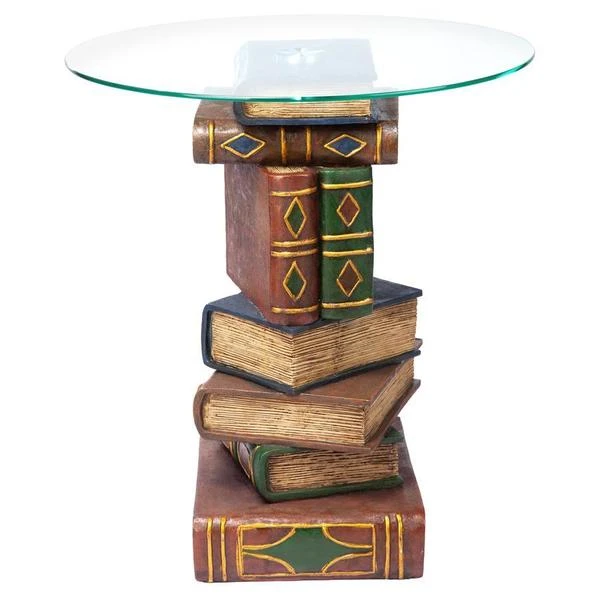 Be "book smart" with this artistically sculpted table that speaks volumes! With a penchant for the literary, this quality designer resin, 360-degree sculptural work of decorative art is hand-painted with faux leather covers, then topped with a 3/8"-thick, pencil-edged glass top to be admired from all angles.