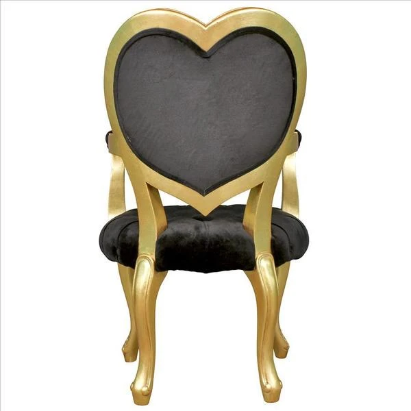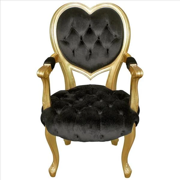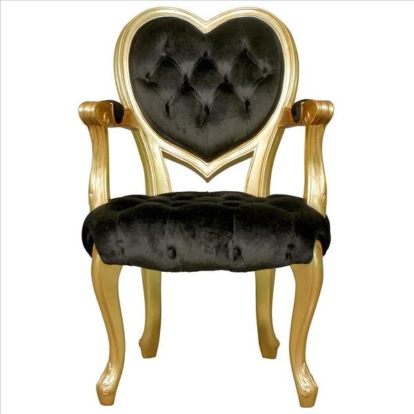 You'll be hard pressed to find a more feminine chair than this classic sweetheart beauty created with elegant shapely curves in the French Provincial style! The fine mahogany frame is hand finished in gold leaf before it is upholstered. Hand-tufted plush ebony velvet upholstery shimmers in the evening light and showcases a heart-shaped back and lovely tufted seat. The unique silhouette of this girly-girl chair makes it simply unparalleled in the boudoir, retail or photography studios, or as part of the wedding celebration of a very special bride and groom. Unforgettable! 271⁄2"Wx25"Dx41"H. 24 lbs. Seat Dims: 201⁄2"Wx241⁄2"D. Floor to Top of Seat: 191⁄4"H. Back Rest Height: 22"H. Floor to top of armrests: 291⁄4"H. Leg Height: 141⁄2"H.