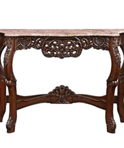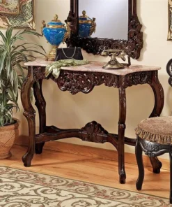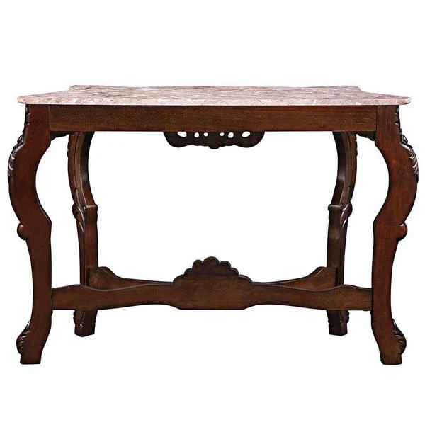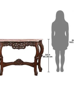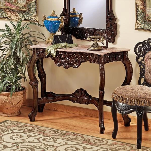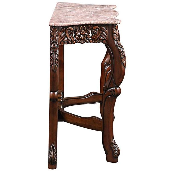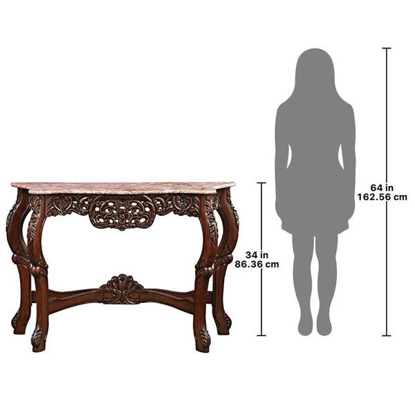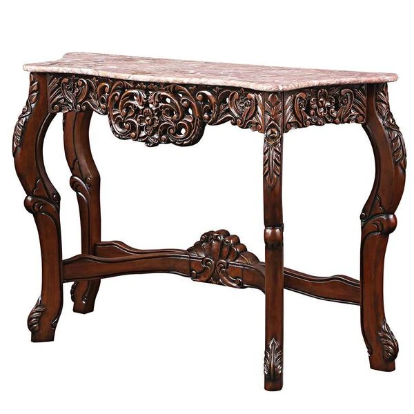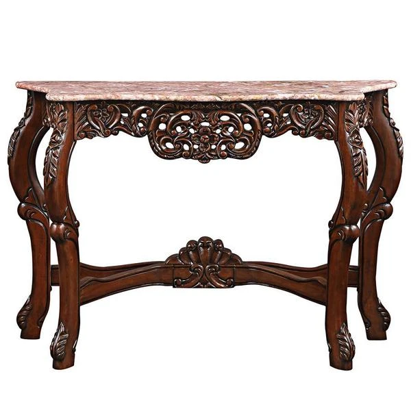Echoing the elaborate palace style of 18th-century France, this gracefully hand-carved hardwood console table is absolutely drenched in a lavish shell foliate motif. Hand-finished in a deep mahogany hue, the console table with shell stretcher rises on four ornate Parisian scroll legs to a curvaceous, variegated rose marble top with bullnose edges. Add this Design Toscano-exclusive signature element to your entryway foyer, library or formal living room and create an elegant history of your own! Simple assembly required. Console: 47"Wx15"Dx34"H. 74 lbs.
