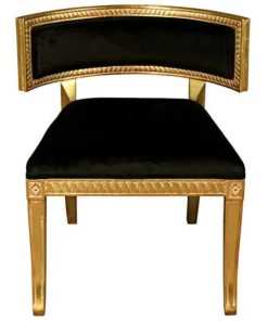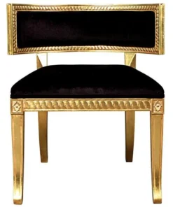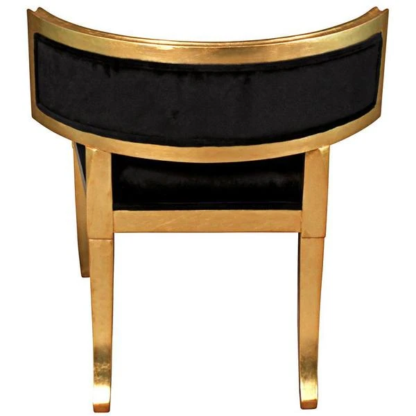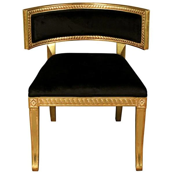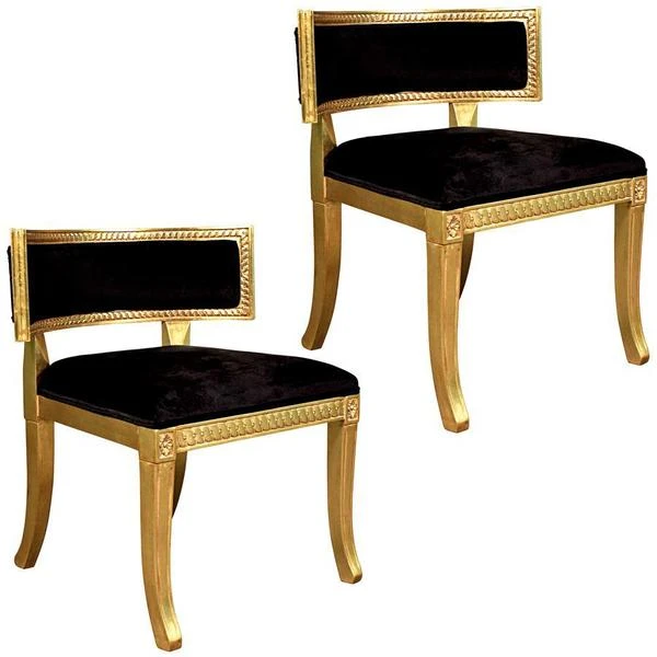 As elegant in today's interior design as it was during its 5th century Greek origin, the romantic curves of the low-backed Klismos Chair have more aesthetic staying power than any chair design in history. With four curving, splayed legs and a concave backrest that perfectly cradles the human body, our historic work of furniture art features faux gilding and lush, ebony velvet upholstery on its plush, square seat. In sensual dance of curvilinear and rectilinear lines, perfect since the time of Caesar, this timeless work with an architecture all its own is brought to you exclusively by Design Toscano. Each: 27"Wx221⁄2"Dx291⁄2"H. 15 lbs.