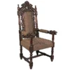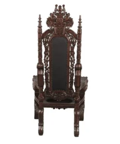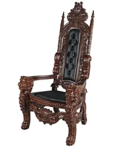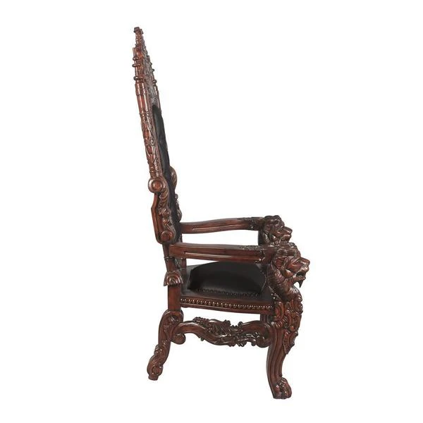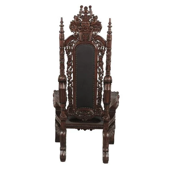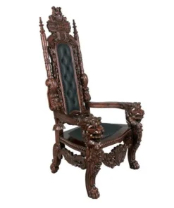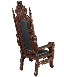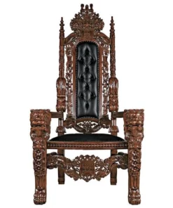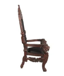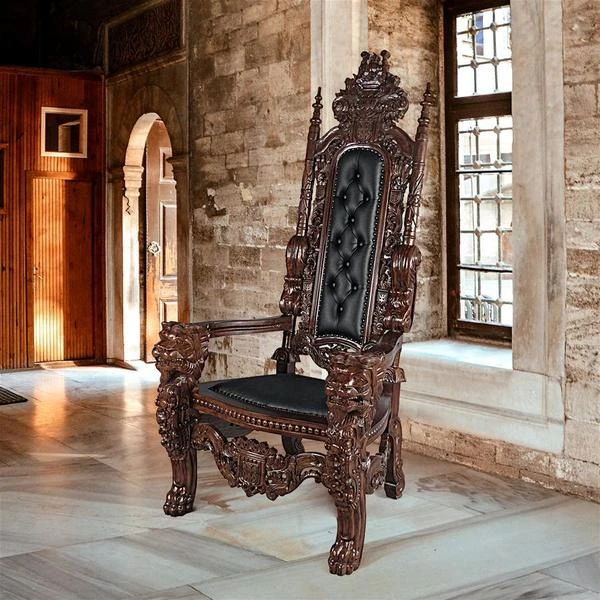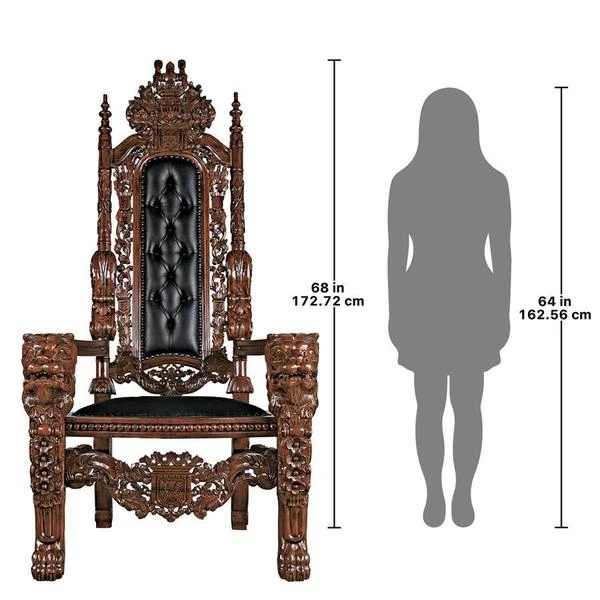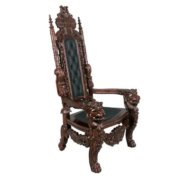 You've come to expect the unexpected from Design Toscano, and so we've purposely outdone ourselves offering you this exquisite medieval antique replica throne chair! Originally created for Lord Thomas Stamford Raffles, who founded the British colony of Singapore, it features deep, large-scale, solid mahogany hand-carvings of massive growling lion heads. The deeply cushioned seat and back are hand-upholstered on both sides in a button-tufted real ebony leather with nail head trim. Our regal Gothic throne is topped by an ornate, hand-carved mahogany coat of arms. Impressive paired or individually. 36"Wx37"Dx68"H. 86 lbs.