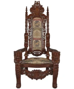 You've come to expect the unexpected from Design Toscano, and so we've purposely outdone ourselves by combing the Gothic castles of Europe to bring you this exquisite Medieval antique replica throne chair! Originally created for Lord Thomas Stamford Raffles, who founded the British colony of Singapore, it features deep, large-scale solid mahogany hand-carvings of royal court symbols and massive growling lion heads that require over a week of work by a single artisan. The comfortable seats and deeply cushioned backs are hand-upholstered and double piped on both sides in a heraldic jacquard of aristocratic gold, burgundy, and navy. Our regal Gothic throne is topped by an ornate hand-carved mahogany coat of arms as an investment in fine European styling. Impressive paired or individually. 36"Wx37"Dx68"H. 86 lbs.
