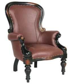 We can't remember if we were first attracted by the tastefully detailed hand-carving or the tobacco-colored faux leather stretched on the dark mahogany, comfortable frame of this wing chair. Whatever the reason, we've continued to admire the detailing-Victorian curves finished front and back with braided trim and hand-carved legs. You'd usually expect to find this much deep-seated comfort only in the library of a mid-19th century English country home. 26"Wx251⁄2"Dx401⁄2"H. 35 lbs.