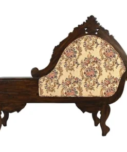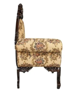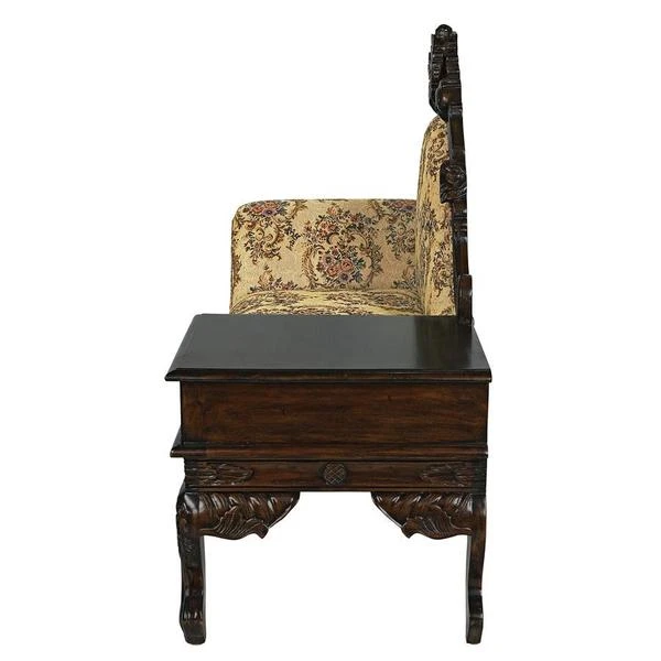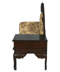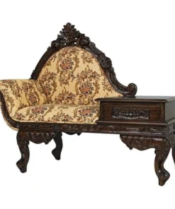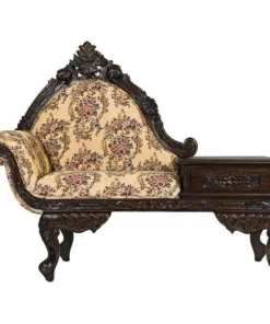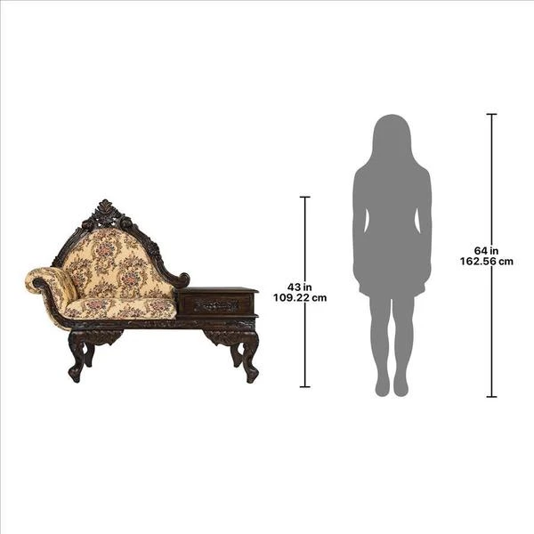 Lean back and luxuriate in the rich jacquard upholstery, then drape your arm over the thickly padded and double welted armrest. Now you are ready to call your friends and invite them to high tea. With its convenient side table and drawer, this exquisite antique replica is as functional as it is stylish. Handcarved from solid mahogany, it boasts a deeply detailed rose motif and features the kind of expert craftsmanship usually found only in true period antiques. Simple assembly required. 54"Wx24"Dx43"H. 62 lbs.