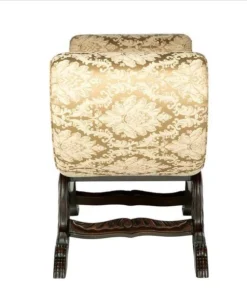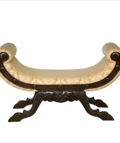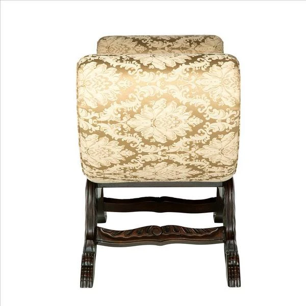 Authentic with character, this bench is hand-carved of solid mahogany, hand-finished, and distressed just enough to replicate a true antique. With carved claw-and-ball feet, its angled legs rise toward textured golden wheat colored brocade jacquard upholstery that wraps around the great scroll arms, and blends easily with any decor. Simple assembly required. 43"Wx171⁄2"Dx26"H. 25 lbs.