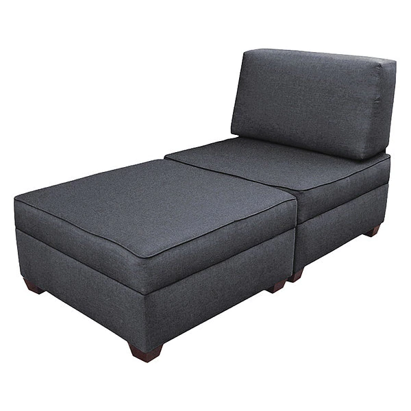 Chaise Lounge, Overall Width 60 in, Overall Depth 30 in, Overall Height 18 in, Upholstery Color Blue, Frame Color Black, Number of Compartments 2, Weight Capacity 275 lb, Assembled, Seat Height 18 in, Ottoman Dimensions 18 in H x 60 in W x 30 in D, Compartment Width 29 in, Compartment Depth 8 1/2 in, Compartment Height 29 in, Upholstery Material Polypropylene, Frame Material Wood, Leg Material Wood, Leg Color Brown, Leg Height 3 in, Leg Glides Included Yes, Removable Seat Cushions No