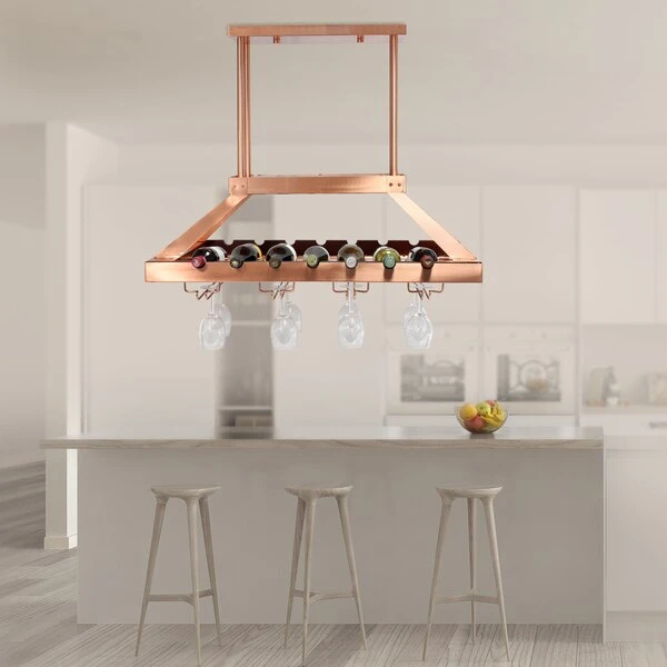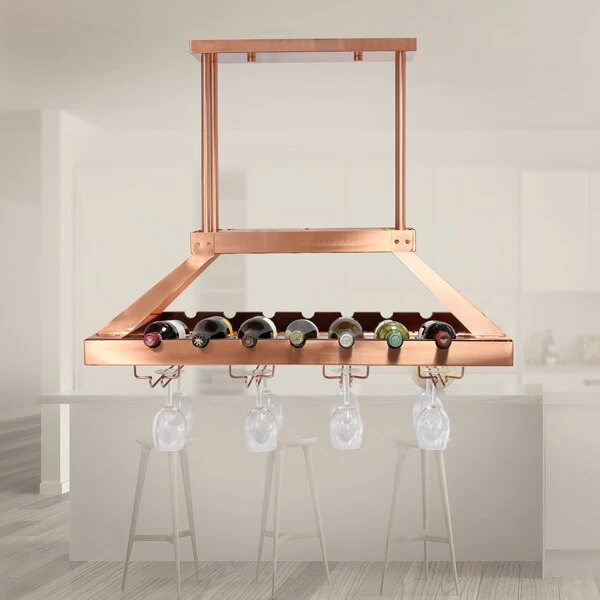 Instead of displaying your variety of wine selections the old fashioned way, why not make the upgrade to this beautiful overhead metal wine rack? Equipped to hold a combination of 14 standard wine bottles and 16 stemmed wine glasses, it serves both a functional and style purpose for your space. This product comes with a total of 12 poles that are suited to adjust the height of the wine rack to adapt to both tall and low ceilings.