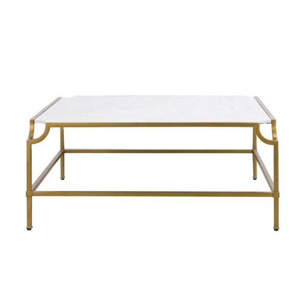 The Blain Coffee Table is a square table with a unique notch detail at each corner. The frame is made from a brass tone finished metal and the top is white marble. This coffee table is an ideal addition to a contemporary living room or seating area.