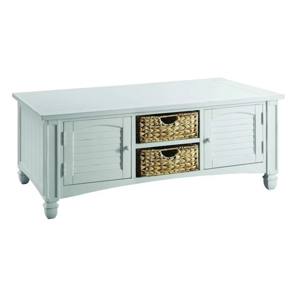 Cottage white storage cocktail with louvered doors, natural sea grass baskets and a plank style top.