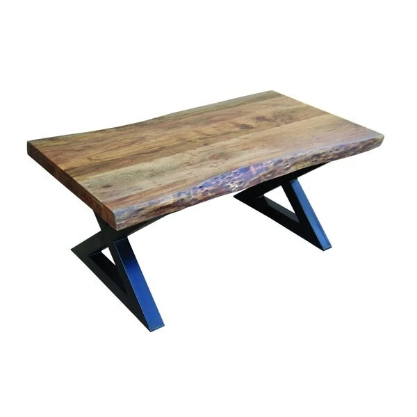 Rectangular cocktail table. Rustic medium brown finished top. "Living Edge" sides. Black metal "X" frame legs.