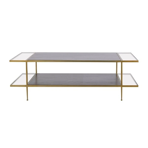 The Carrick Coffee Table is a two-tier coffee table framed in a brass tone finished metal. The top and lower storage shelf each features central rectangle of dark mahogany-stained wood top, with clear tempered glass panels on either side.