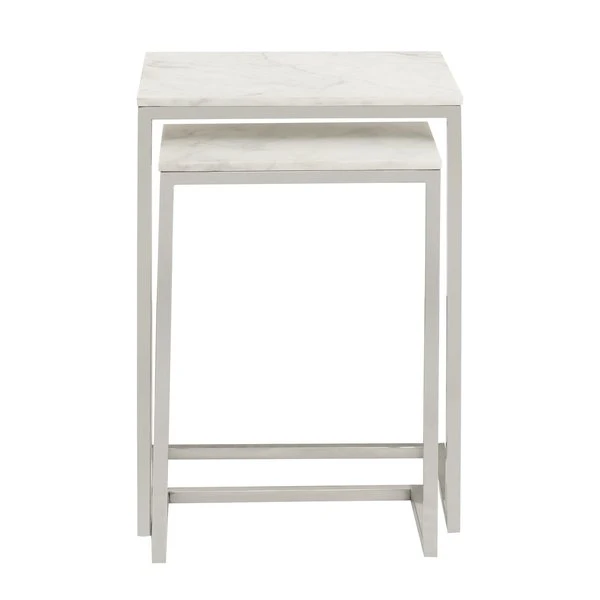 The Affiliate Side Tables combine contemporary style with space saving form. The C shaped metal frame allows the smaller partner to be nested under the larger one, and both can slip comfortably over a low-profile sofa. The sleek, modern style of the Affiliate tables are finished by durable, white marble tops that give a luxe note to the look.