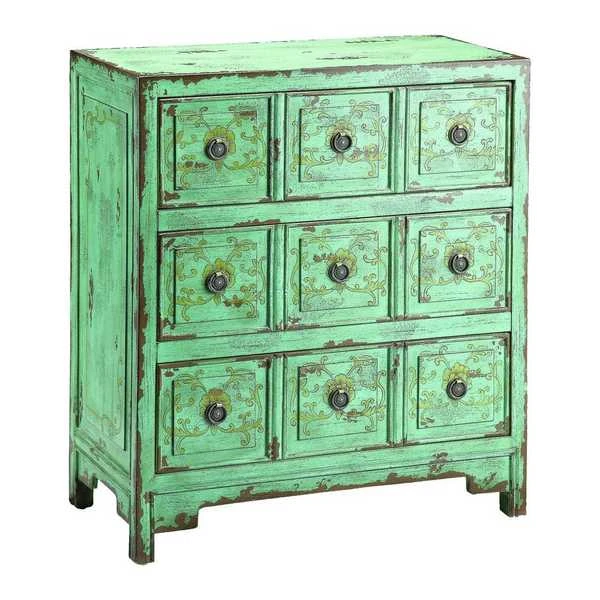Lovely hand painted vintage green apothecary style chest features a faded goldenrod floral motif and three drawers.