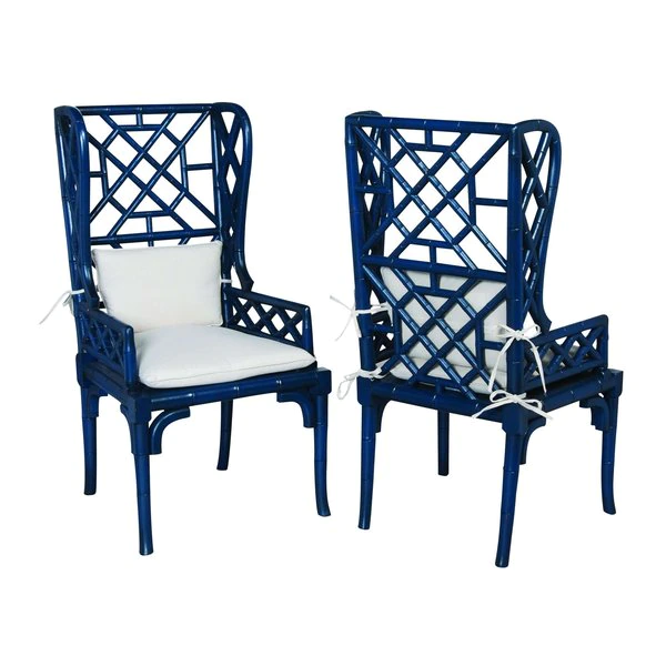 Woodlands Molten Lava under Black finish on hand-carved wooden bamboo design chair. Oyster fabric on cushion. Pair.