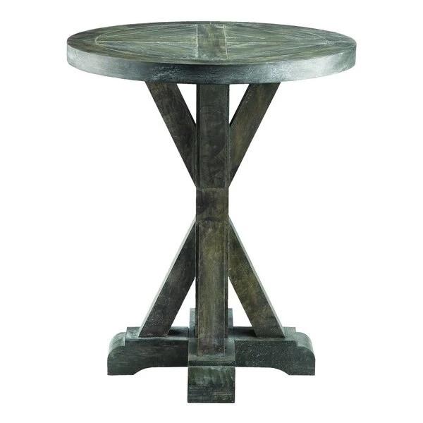 Round chair side table constructed of solid wood and birch veneers with a weathered grey finish, plank style details, double X legs and an X base.