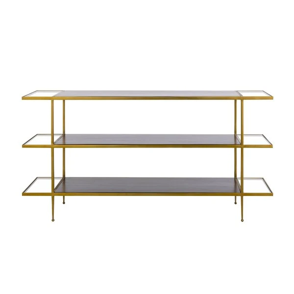 The Carrick Console Table is a three-tier console table framed in a brass tone finished metal. Each shelf has a central rectangle of dark mahogany-stained wood top, with clear tempered glass panels on either side.