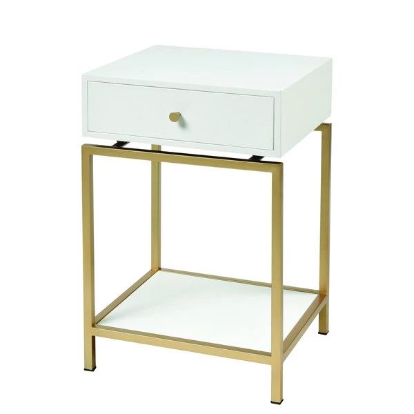 The Clancy Accent Table is a black faux shagreen table with a single drawer, floated on an open metal base with a low open shelf below, also lined with black faux shagreen.