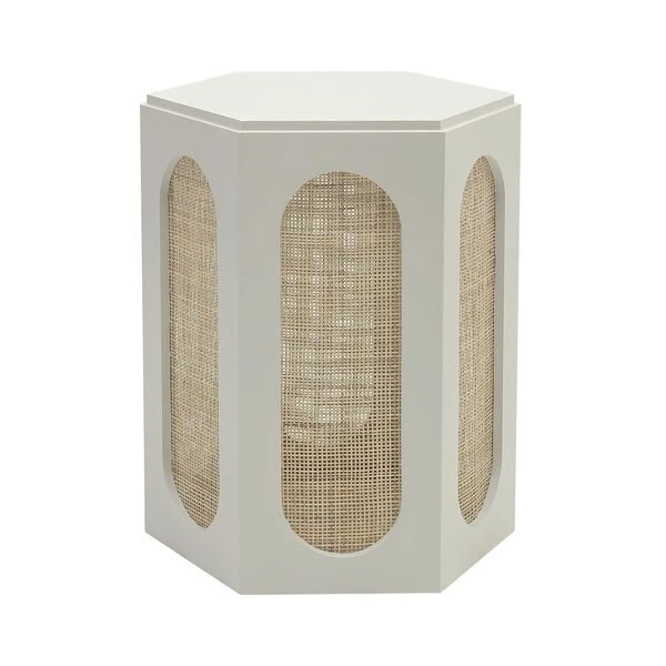 The Clearwater Accent Table has a hexagonal shape, and each side features woven rattan panels in a white washed finish. This coastal casual table works in a variety of interiors, and adds visual interest to a living room or seating area.