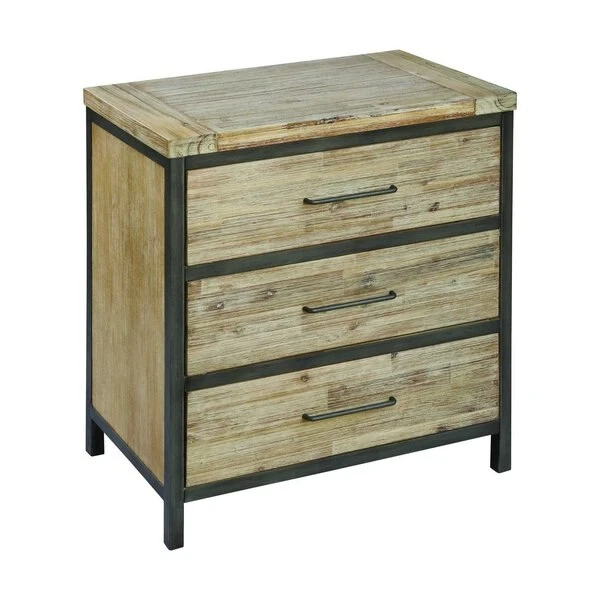 The Cork County 3-Drawer Chest is a small chest framed in iron. Drawers, top and sides are made from acacia wood in a natural finish. The pairing of iron with natural wood adds rustic, industrial charm.