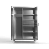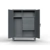 The Crafton Cabinet is a two-door storage cabinet with a white painted wood top and sides and adjustable shelves within. The quarter-cut straight grain veneer on the doors create a sunburst pattern that extends from the central point on the piece, where two brass tone metal handles meet. The metal base frame extends up and around the sides of the piece for added visual interest.