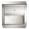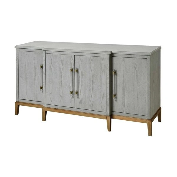 The Geneva Credenza has a grey painted ash finish and vertical acrylic handles cuffed with bronze-finished metal. Its two center doors extend a few inches forward, adding a few inches of crucial depth to its inner shelves. The base has a natural wood finish for a touch of warmth.