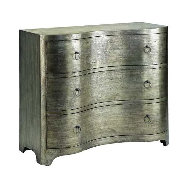 Modern serpentine chest, three drawers, drop ring hardware, hand painted textured pewter metallic finish over silver leafing.