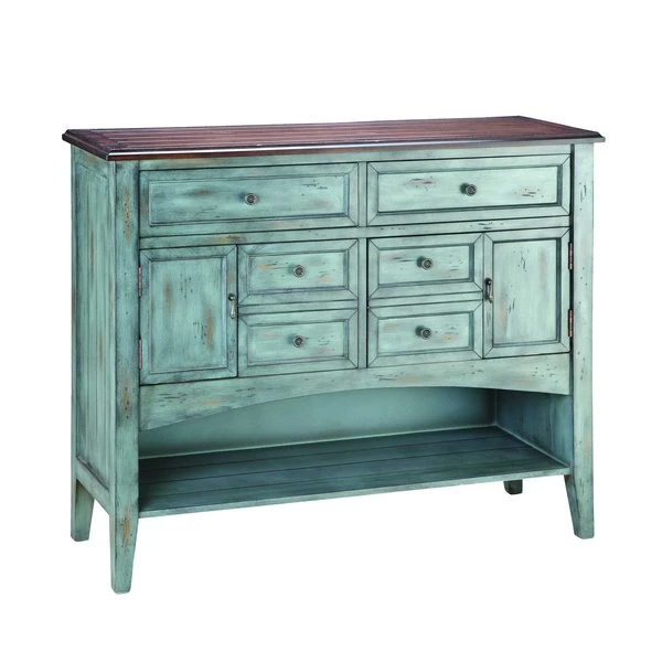 Two-door, six-drawer cottage inspired buffet server. Hand-painted moonstone blue finish with wood-tone top. Extra storage on lower plank shelf. Traditional teardrop pulls and floral design knobs.